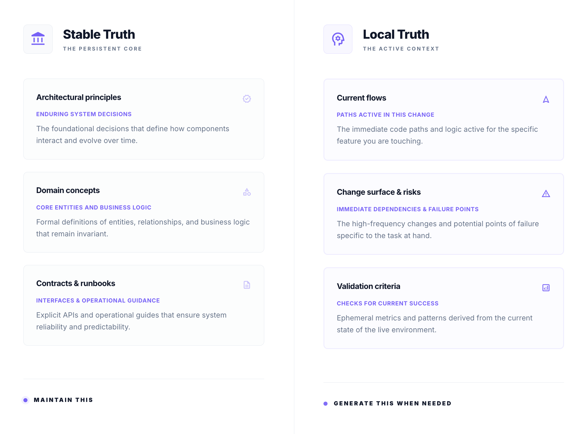 Everything else is usually better generated at the point of need: which part of the system matters for this change, how a flow works today, which patterns are relevant, and where the real risks and opportunities lie. This is local truth. It shifts with every merged PR. Trying to keep that permanently up to date is usually a losing game.