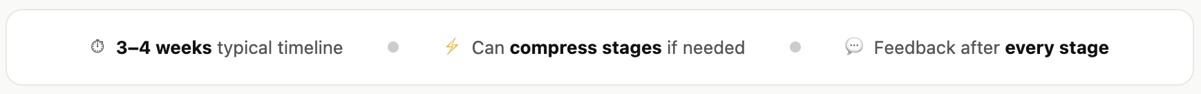 If you're already in other processes, or you need to move more quickly, just tell us. We can compress stages, run things in parallel, or adjust timing. We'd rather adapt than lose someone good because our process was too rigid.