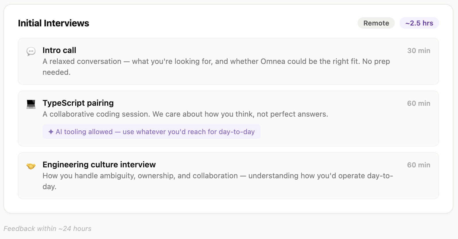 Interviewing takes time and energy, and we don't take that lightly. Before each stage we'll tell you what's involved, what we're looking for, and who you'll be speaking with — no surprises. We aim to share feedback within 24 hours of each stage, and we're not looking for perfect answers, we're looking for how you think. This is also a two-way process: ask us hard questions, challenge our thinking, and make sure Omnea feels like the right place for you.