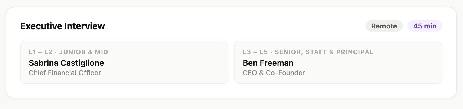 The final stage is a conversation with one of our executives, depending on the level of the role. For junior and mid-level positions (L1–L2), you'll speak with Sabrina Castiglione, our CFO. For senior, staff, and principal roles (L3–L5), you'll speak with Ben Freeman, our CEO and co-founder.It's a genuine two-way conversation — what you want from your career, what we're building, and whether this feels like the right place. It matters, so come prepared, but it's not a gotcha.