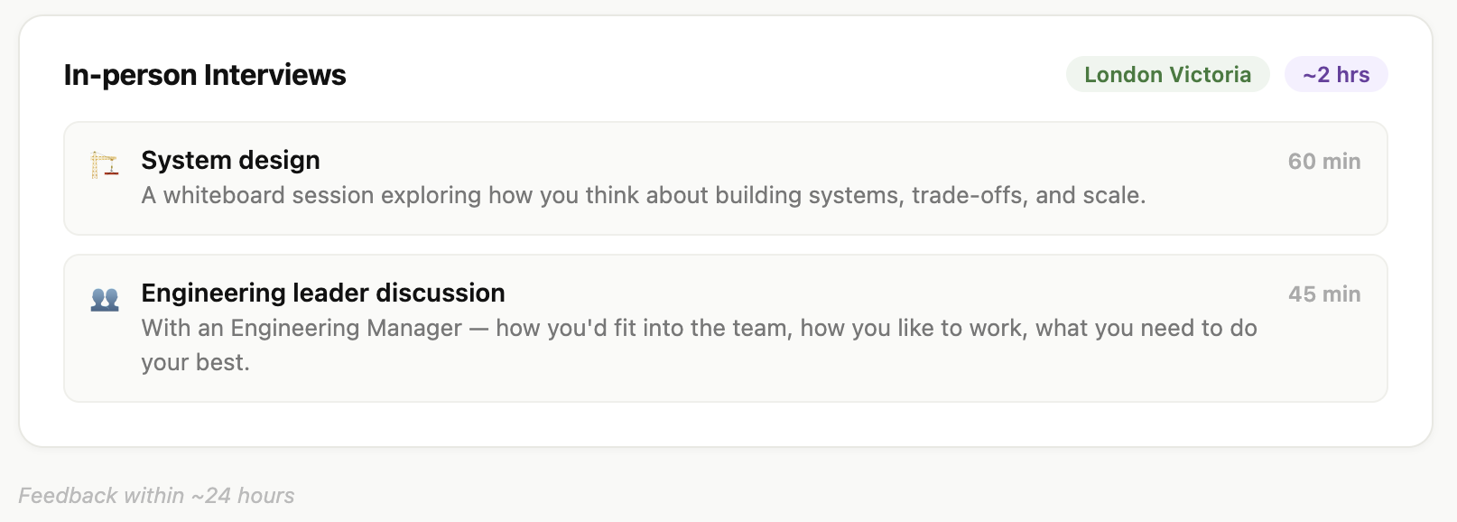 All our engineering and product teams are based in London. We're in the office Tuesday to Thursday, with Monday and Friday flexible.
