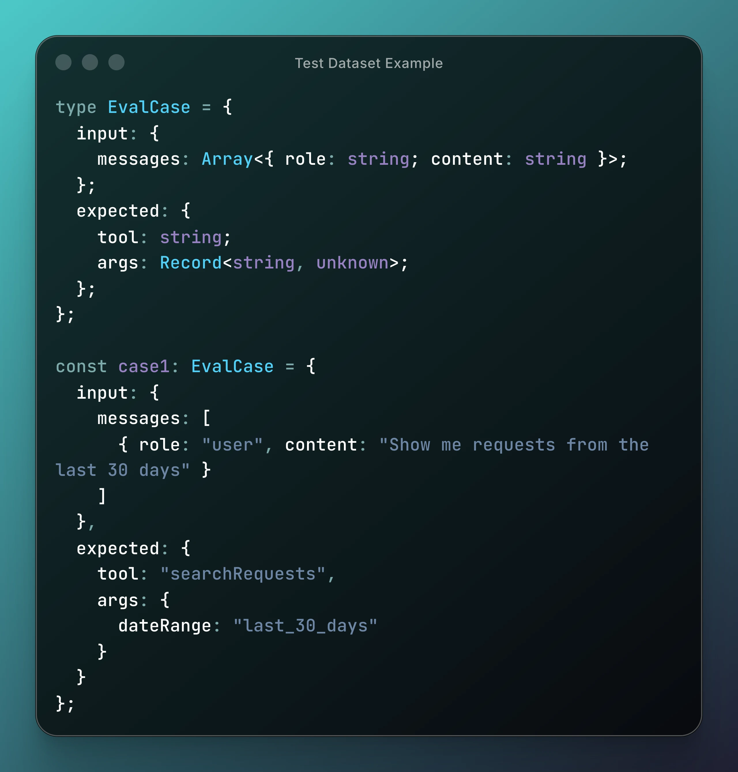 When thinking about AI output, it’s common to judge it on whether the text looks good. But because our AI features sit inside structured product workflows, we need to consider more than just prose - they're triggering actions, calling tools, retrieving structured data. That means instead of asking "does this response look good?" we need to go further: did it call the correct tool? Did it pass the right arguments? Did it respect the constraints we gave it? Did it hallucinate fields that don't exist?