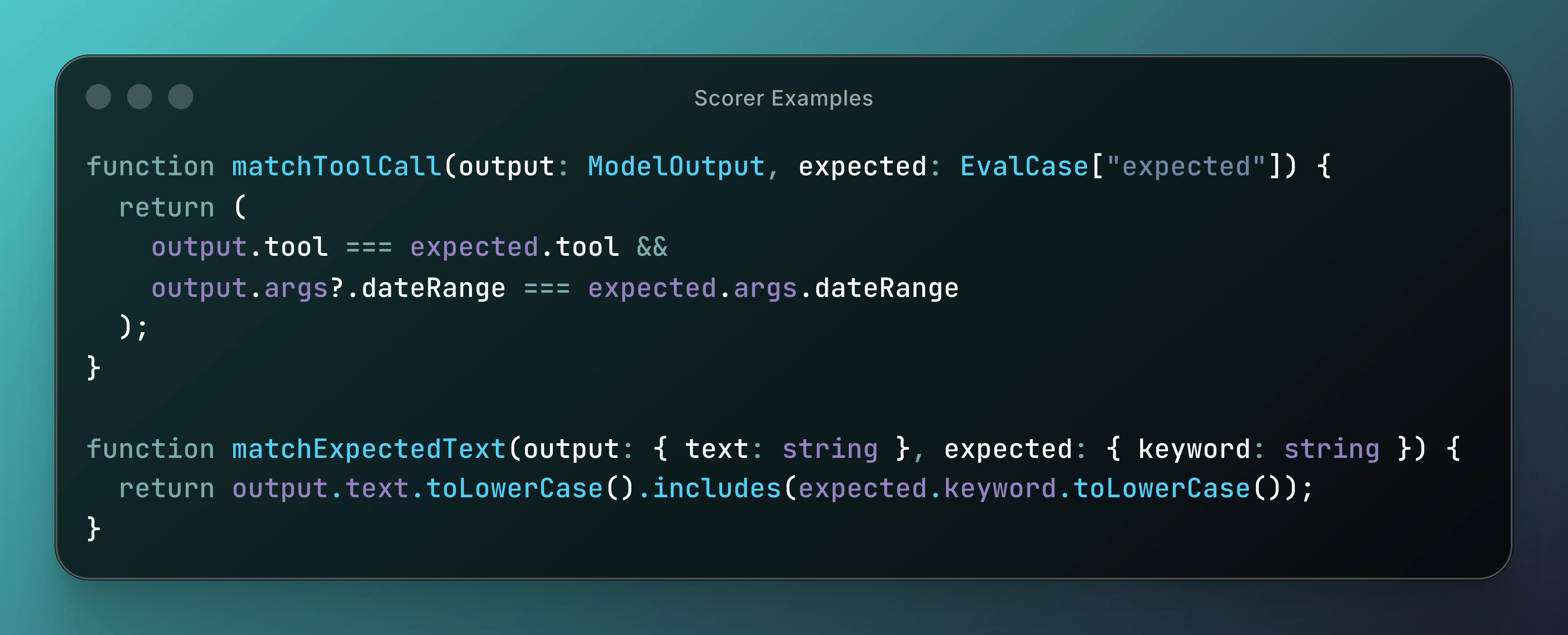 Second, you need 🥇 scorers: the logic that looks at what the model actually produced and decides whether it was right, partially right, or wrong. This could be a simple function that checks if the right tool was called, or it could be another LLM evaluating the quality of a summary.